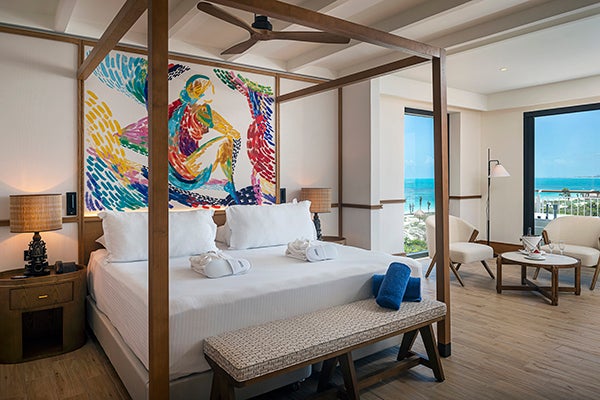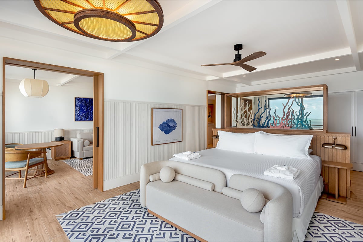 As suites do Ocean Allure Costa Mujeres são amplas e luminosas, com um design contemporâneo inspirado no ambiente marinho. Foram concebidas em tons claros e materiais de alta qualidade, destacando-se as cabeceiras, presididas por tapeçarias estampadas em cores vivas de mulheres num ambiente caribenho.
